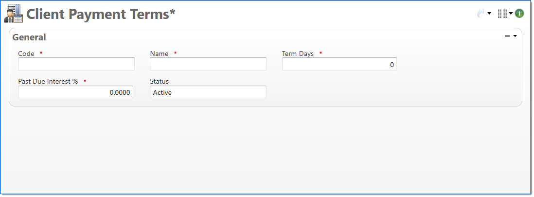 The Client Payment Terms screen defines the number of days from the Bill Document Date that the client must pay a bill or be penalized with past due interest. A payment term is assigned to each client and becomes the default for the project bill terms.