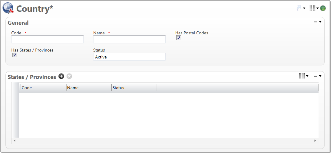 The Country screen allows you to define countries and any related states or provinces. This information is used in addresses throughout the application.