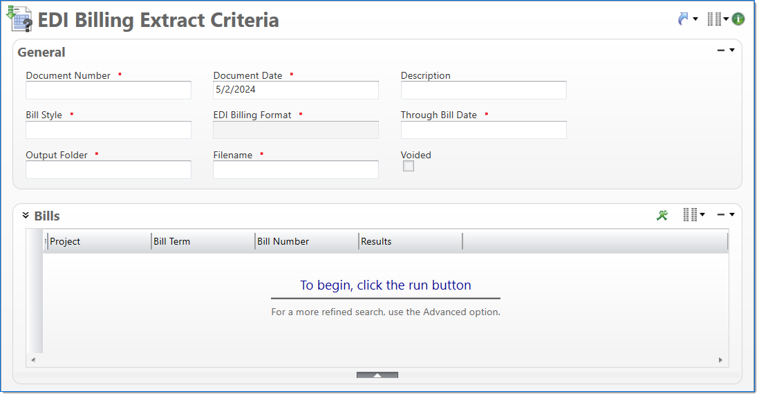 | Voided | Displays that the current EDI Billing Extract document has been voided. This is populated by the EDI Billing Extract Criteria Void Process | |