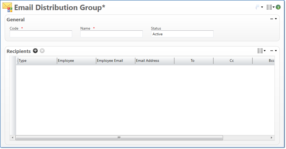 In the Recipients area, add all of the recipients that should receive an email for the distribution group. A recipient can either be an employee or a specified email address. At least one recipient must be defined for the group.