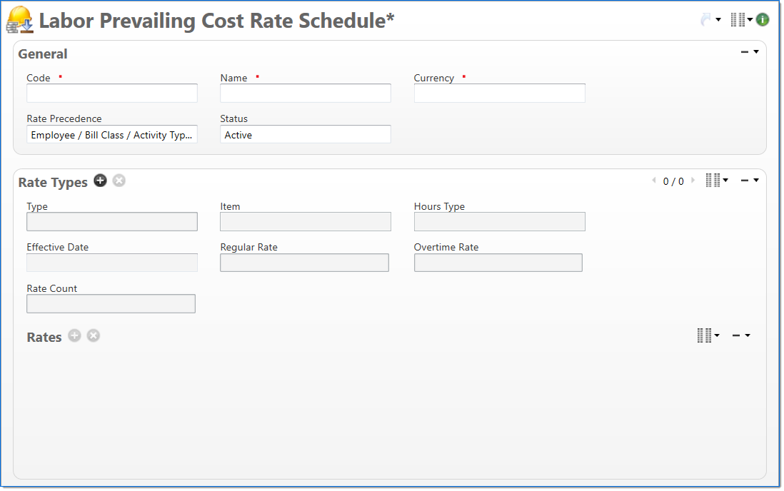 In the Rate Types area, enter or select the rate types associated with this labor prevailing cost rate schedule.