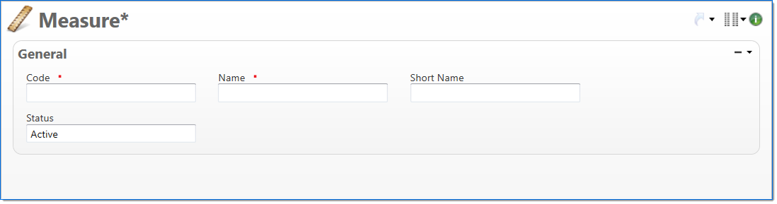 The Measure screen allows you to define a unit of measure that can be assigned to a unit. This is used to measure the quantity entered for a unit. It is also used on reports and in billing to describe the value of the units.