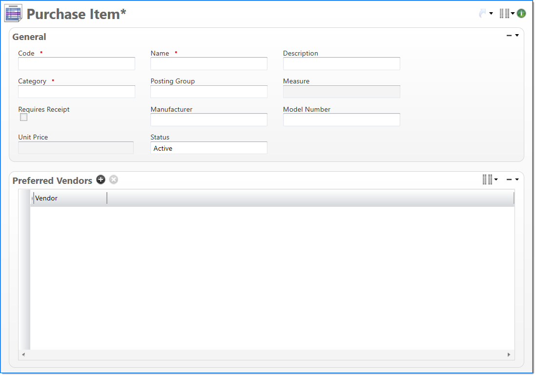 The Purchase Item screen is used to define common items that are purchased. These purchase item codes are assigned to purchase orders. These codes are used to determine category, measure, and company information per purchase item. The purchase item also allows users to enter and view preferred vendors.