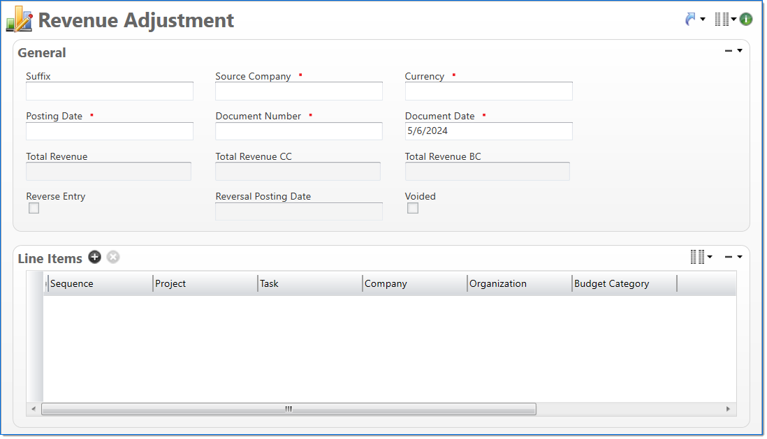 | Total Revenue | Displays the total amount of revenue to be adjusted. This is a sum of the detail lines. | |