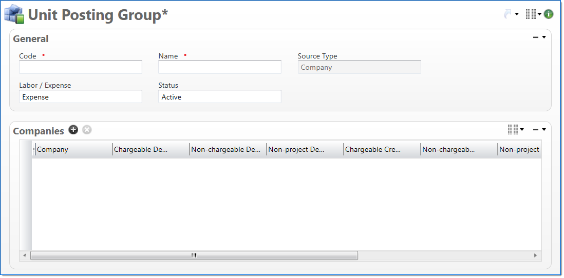 The Unit Posting Group screen allows you to add and define unit posting groups. Unit posting groups are used to control how units that do not use equipment are posted. This includes the available list of companies and the general ledger accounts and credit organizations. Once submitted and moved to a final state, the unit posting group code cannot be edited.