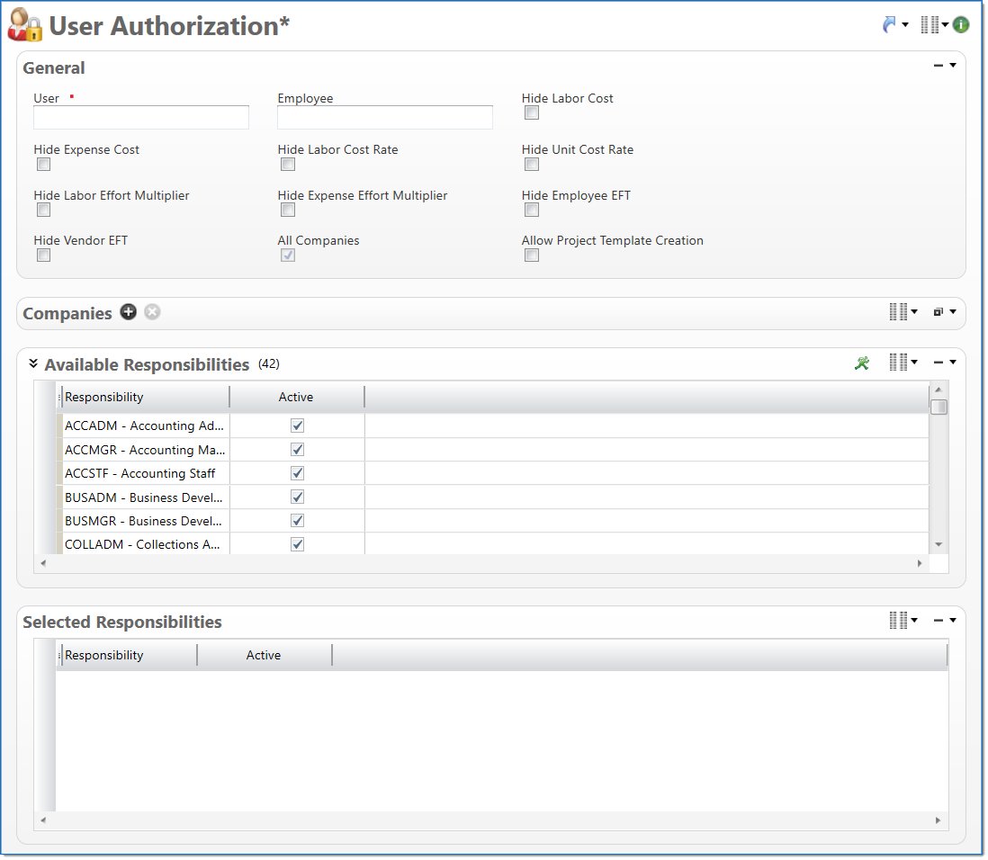 In the Companies area, select one or more companies that the user is authorized to access. This option is used only if the user is to be limited to certain specific companies out of all the companies defined in the database.