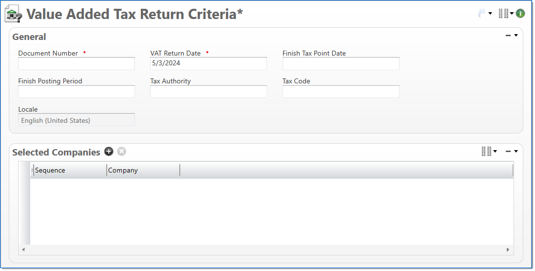 | Finish Tax Point Date | Enter or select the tax point date. This date is used to restrict which VAT Detail records to include in the tax return. A value must be selected in this field or the Finish Posting Period field. | |