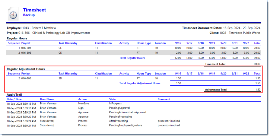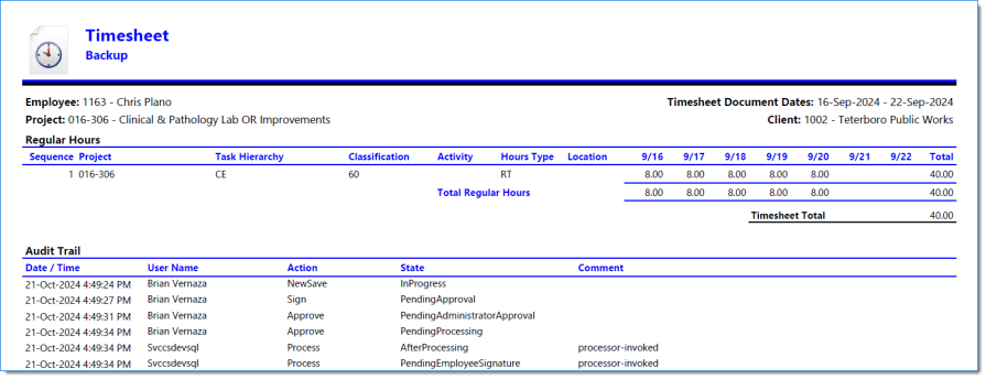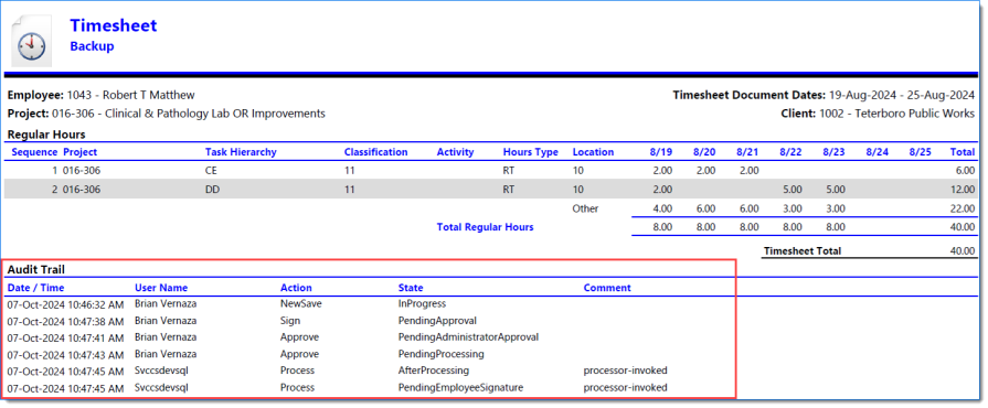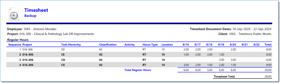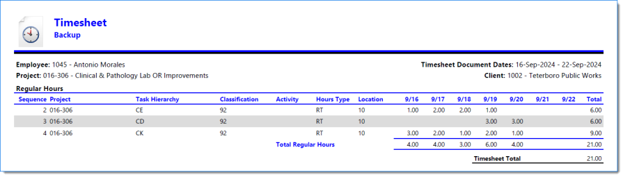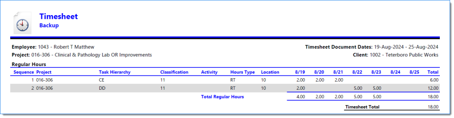 Example of Timesheet when Include Report is selected