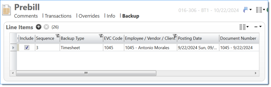 Example of Prebill Backup with one timesheet report per backup Bill Task, with transactions