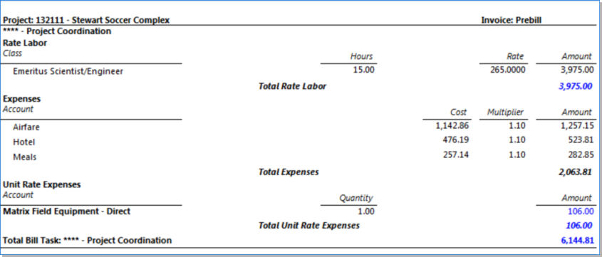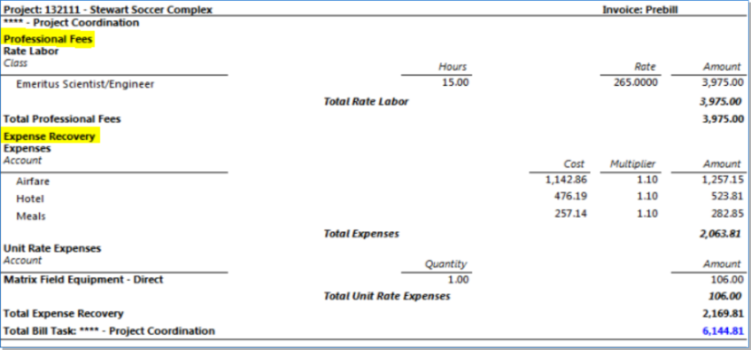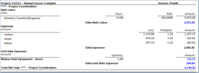 Shows Unit Expense Cost Rates and Multipliers on both the Prebill and Final Bill